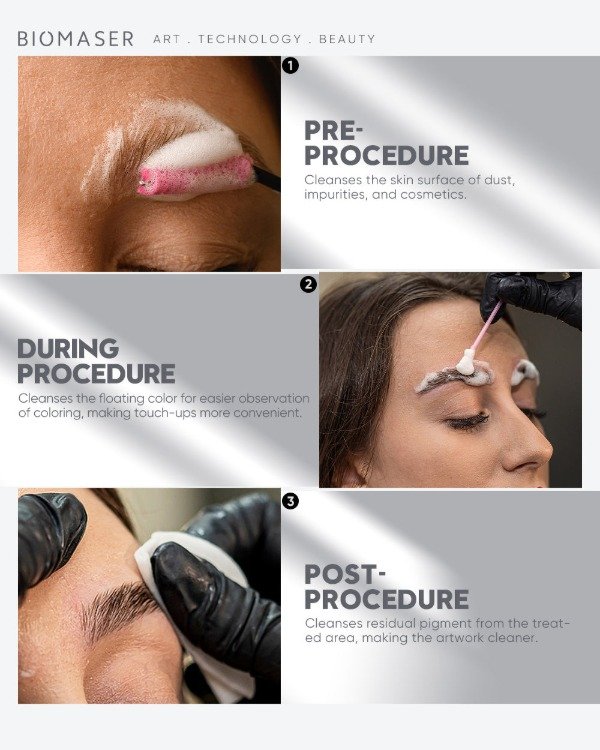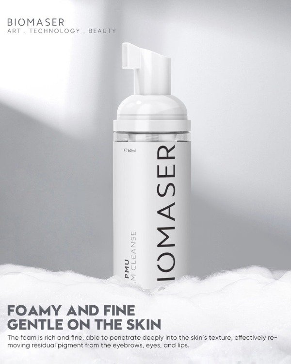 Biomaser all PMU Foam Cleanse es una espuma limpiadora profesional para maquillaje permanente (cejas, ojos, labios). Elimina de forma segura los residuos de color, no irrita y es adecuanda para usar antes, durante y después de los procedimientos de PMU. Con una espuma rica y fina, limpia profundamente para garantizar un trabajo impecable